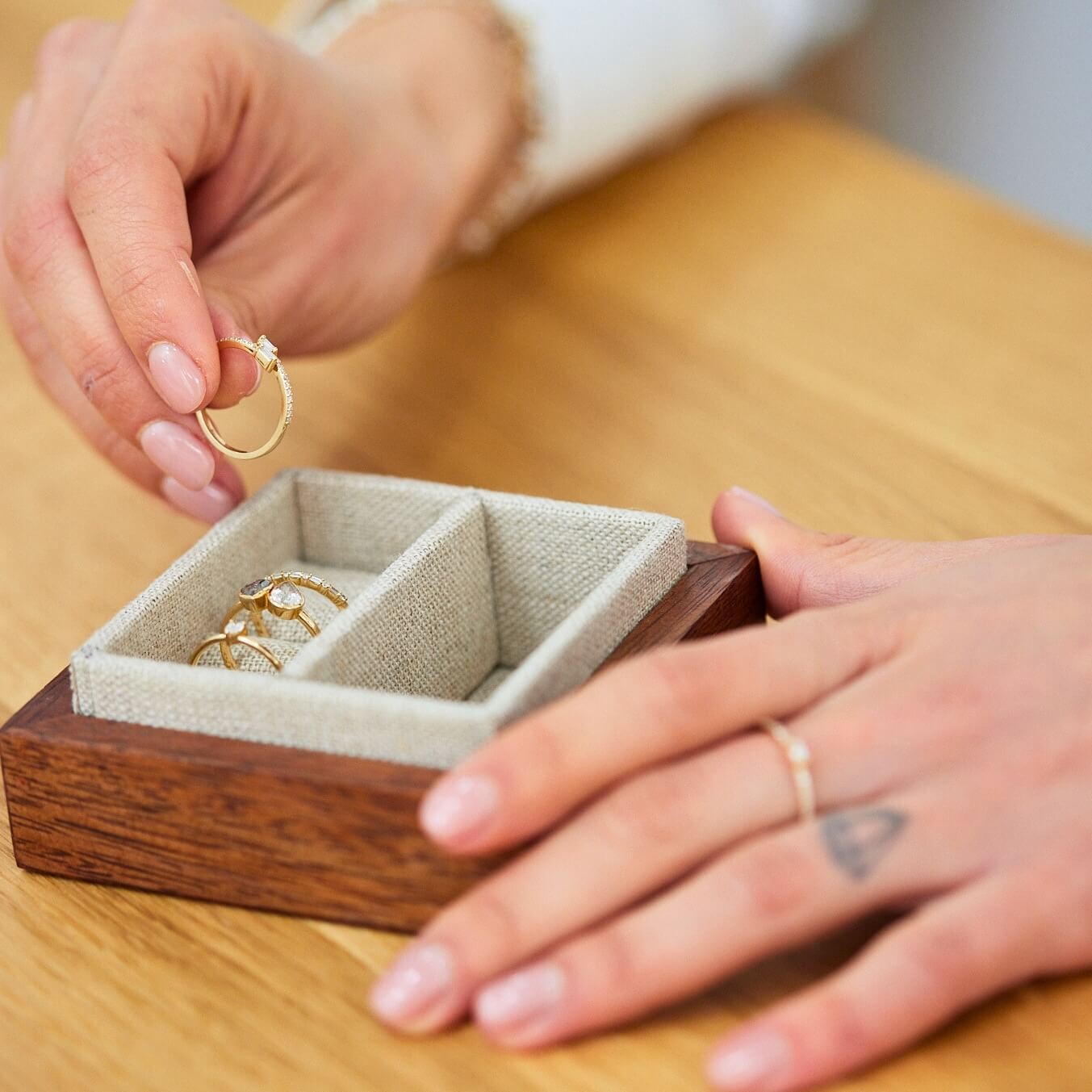 Our Bella Sherban box is the perfect dark, dry and cool place to store your jewelry. If possible, store your pieces individually to prevent them from scratching or tangling.