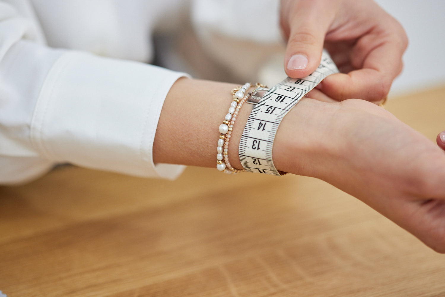 To get started, you will need to take the circumference of your wrist. For best results, use either a measuring tape or a simple string. Wrap whichever you choose around your wrist and mark the spot where the piece meets to get your estimated measurements. Then simply add 1.5 cm (0.6″) and, voilà!