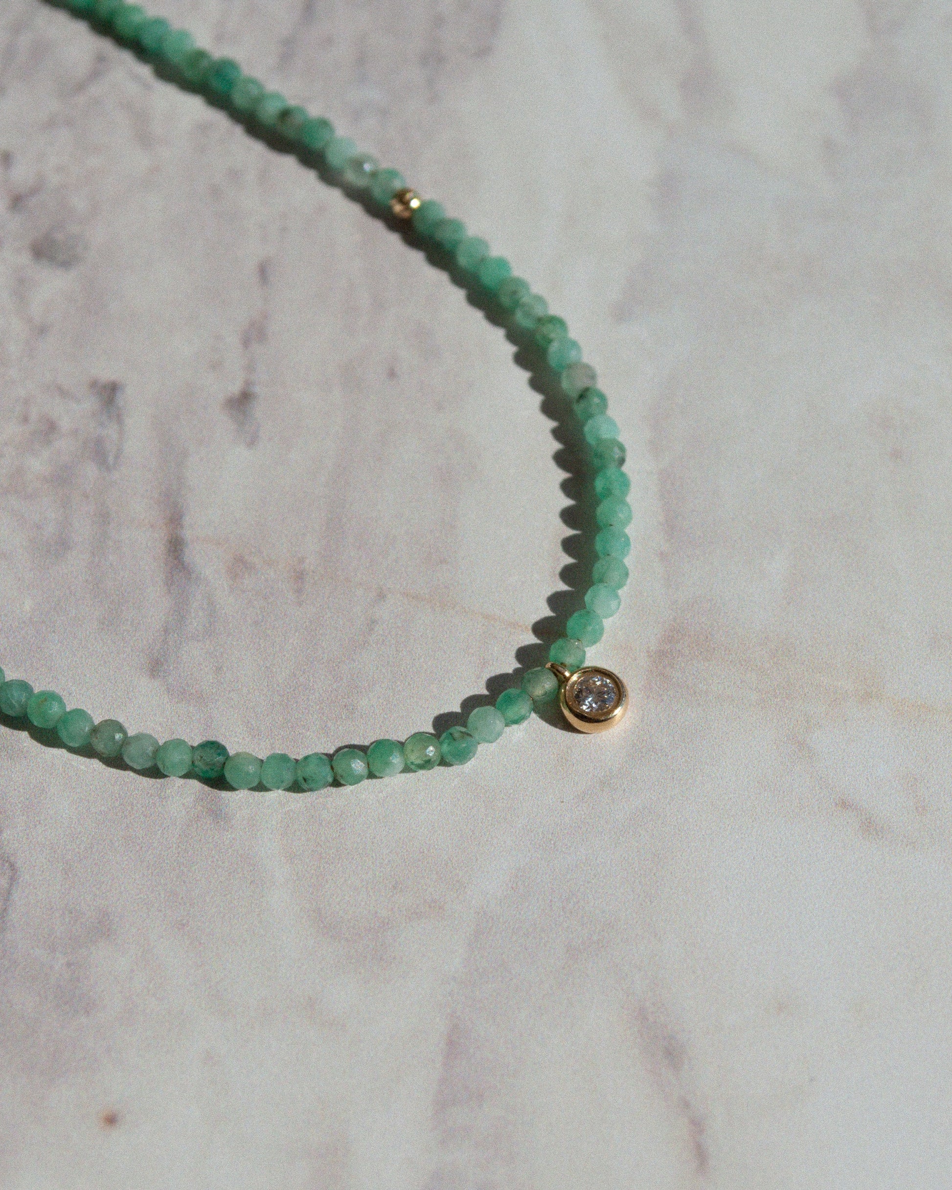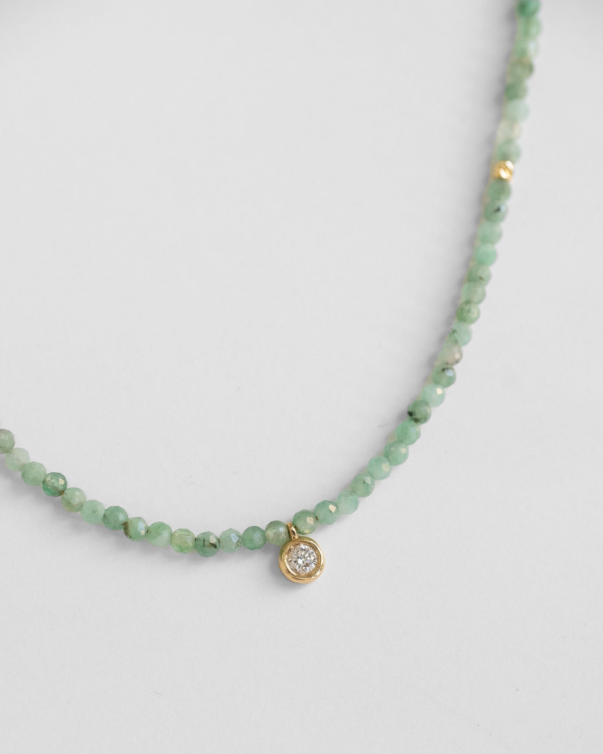 A classic round cut diamond in a 14k solid gold bezel accompanied by emerald beads. If you are looking for a classic with a twist, look no further, this necklace is sure to satisfy.