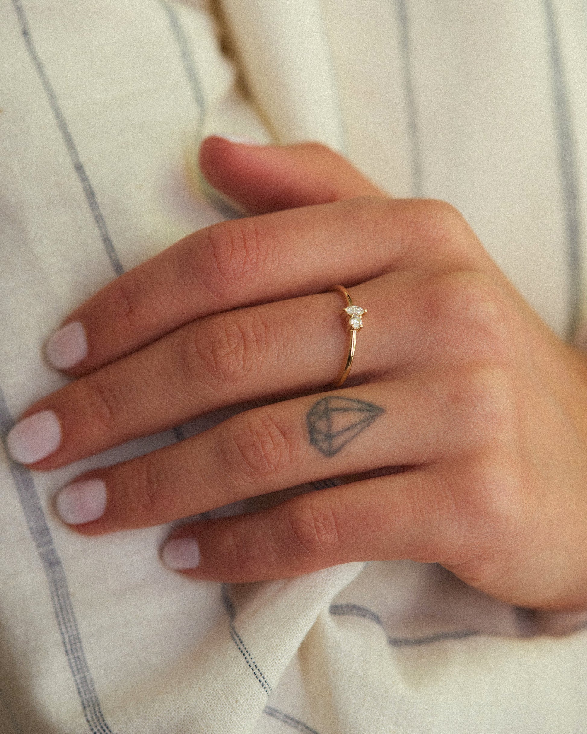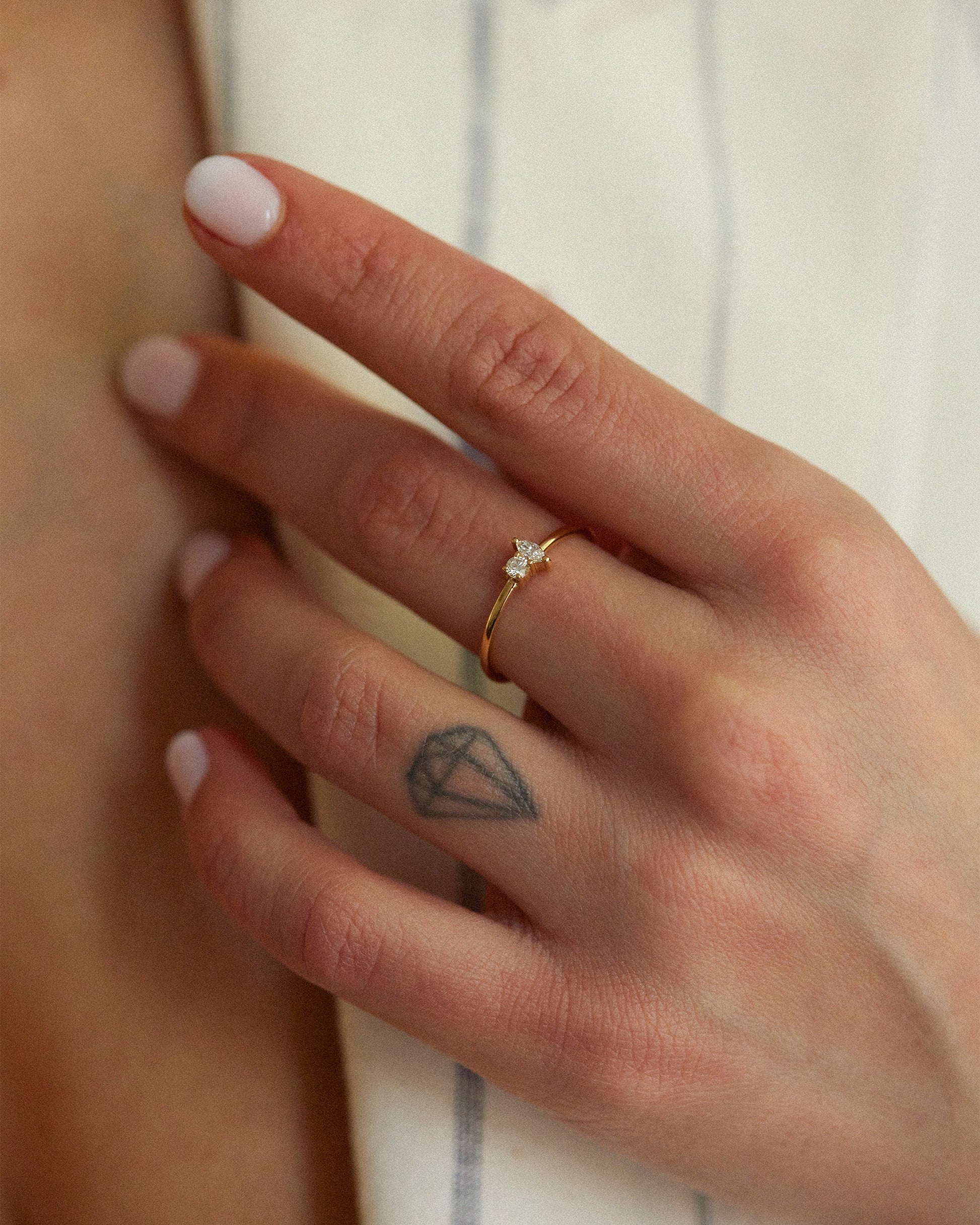 This elegant 14K solid gold ring will be the perfect addition to any jewelry collection. Crafted with a marquise cut diamond and a round cut diamond, this feminine and minimalist design is sure to make a statement.