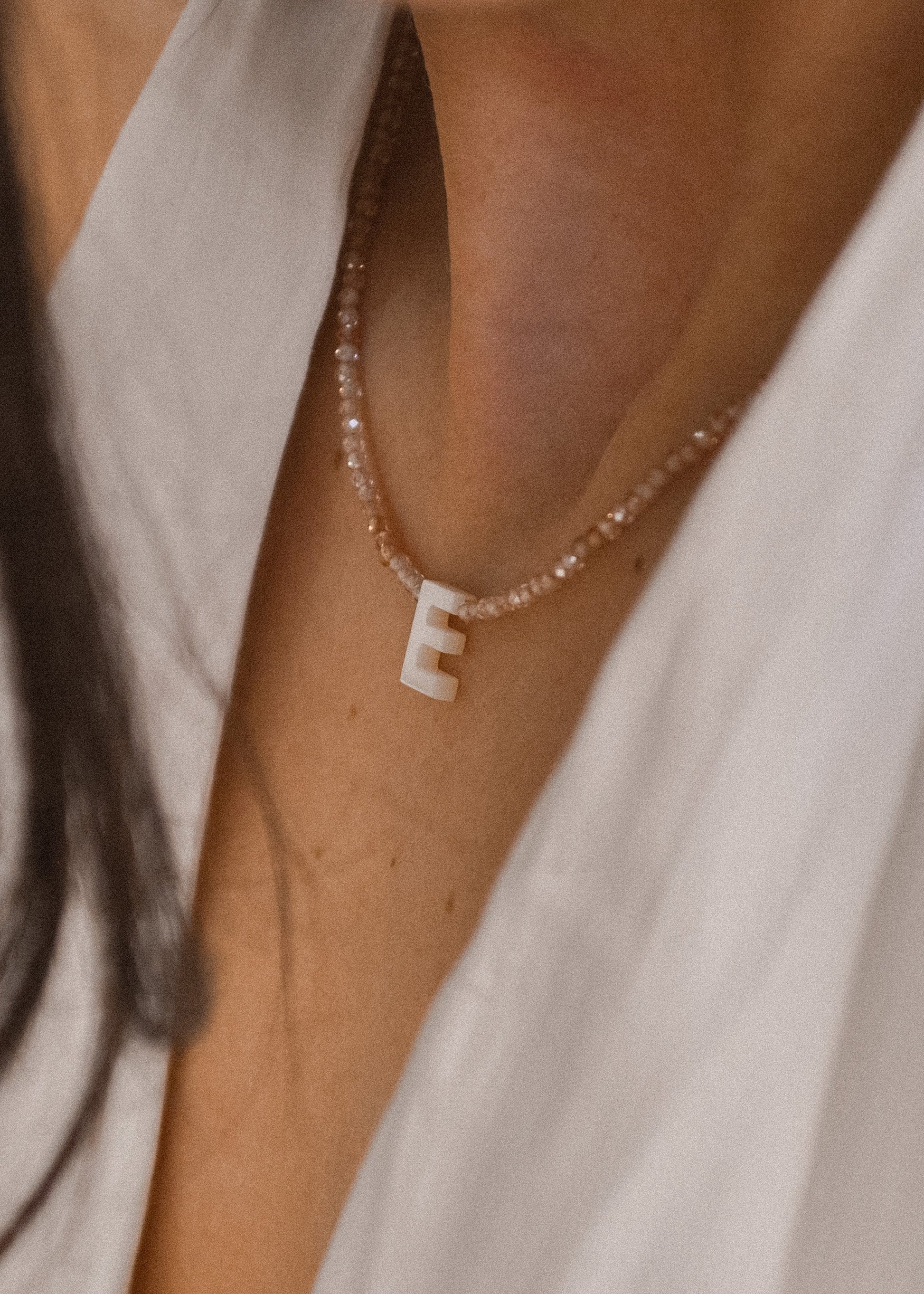 Our all-time bestselling necklace is a versatile piece that can be worn with many different outfits. Handcrafted from warm beige zirconia beads and a mother of pearl letter. You can choose between a gold vermeil or a sterling silver finishing.