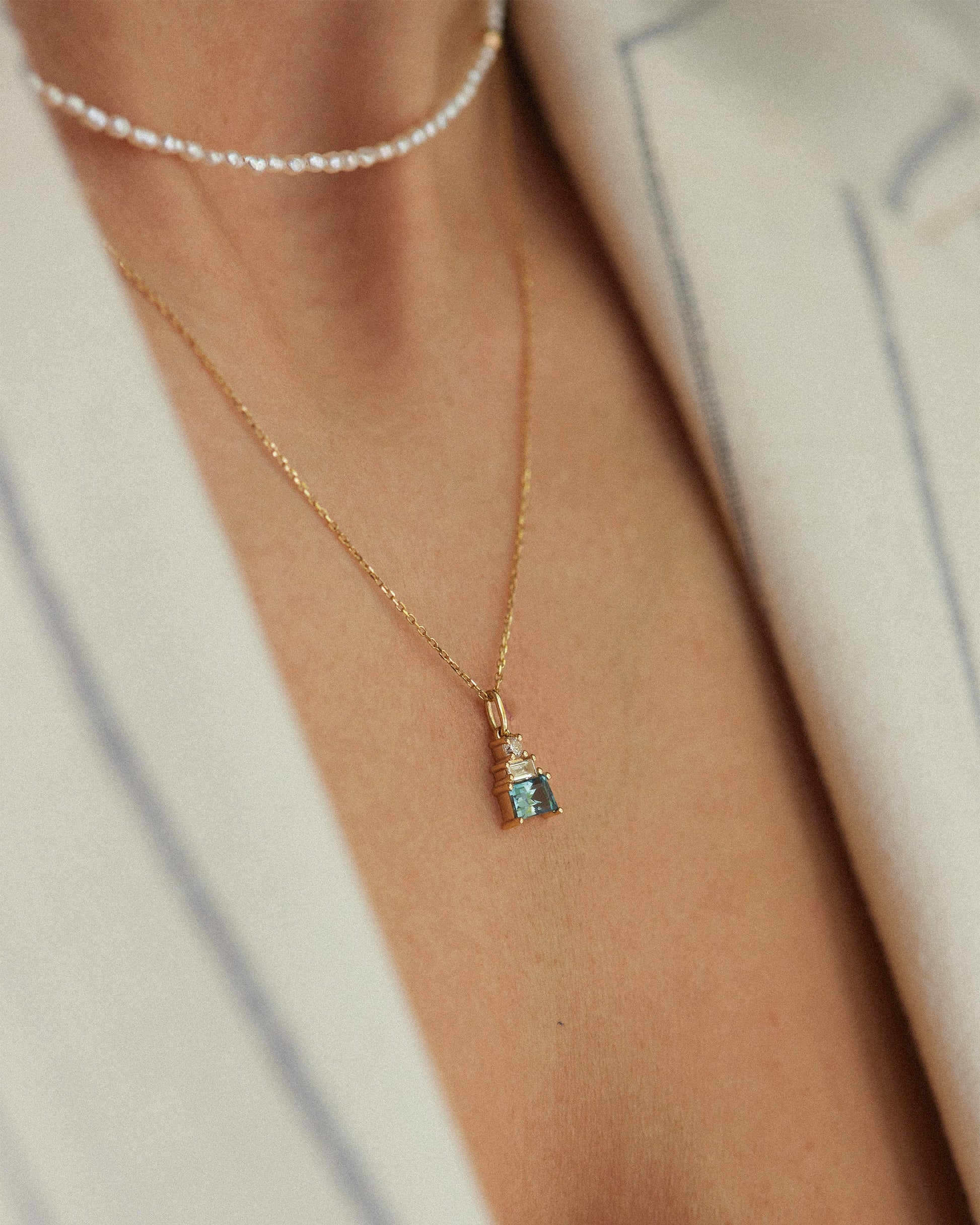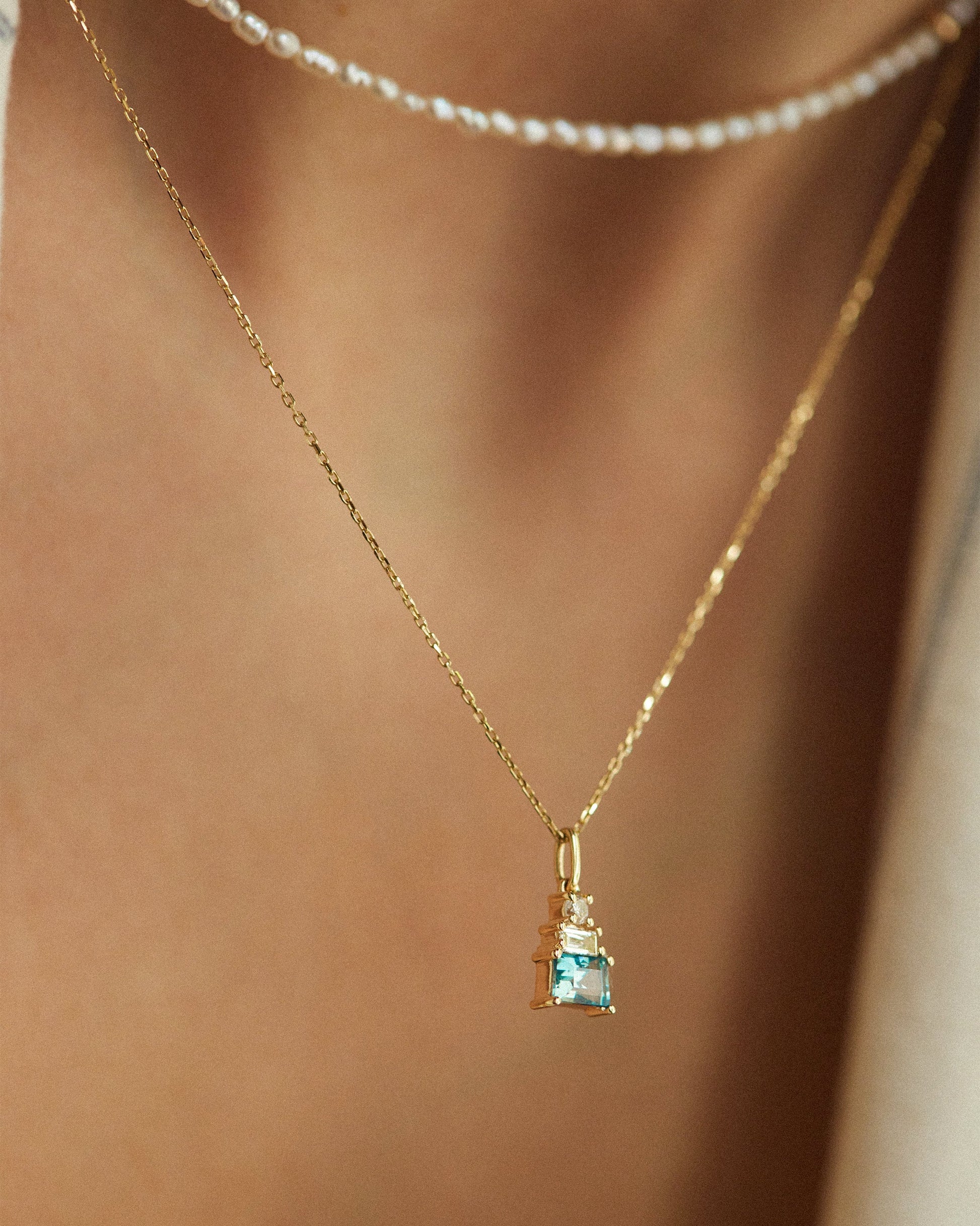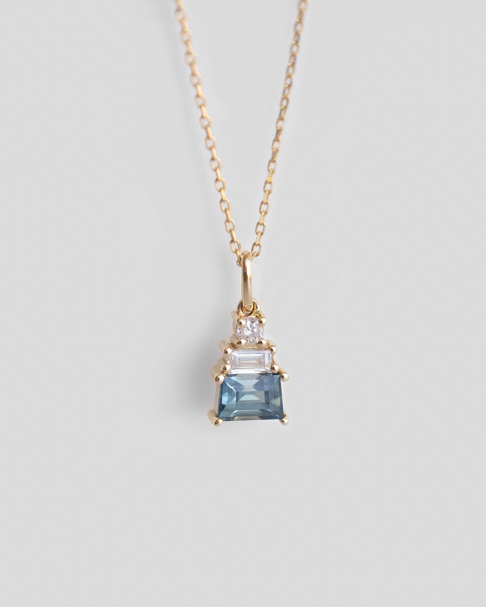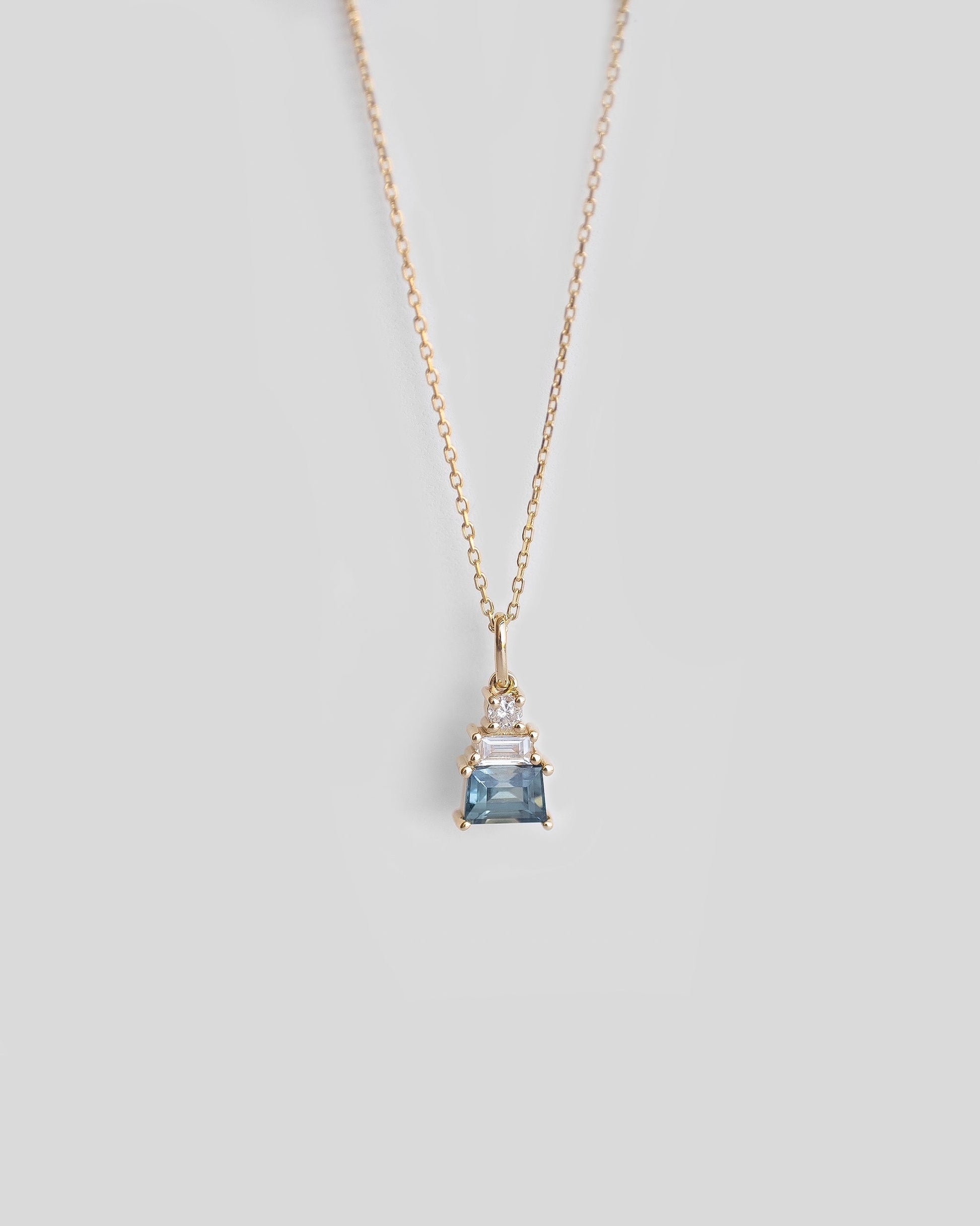 Introducing our one-of-a-kind Teal Sapphire and Diamonds Necklace, a true testament to uniqueness and style. The exquisite piece features a trapeze-cut teal sapphire, accompanied by a baguette diamond above it and a round diamond on top, creating a captivating combination of gemstones that exudes elegance. This necklace defies convention and embraces individuality, making it a perfect accessory for those who dare to be different.