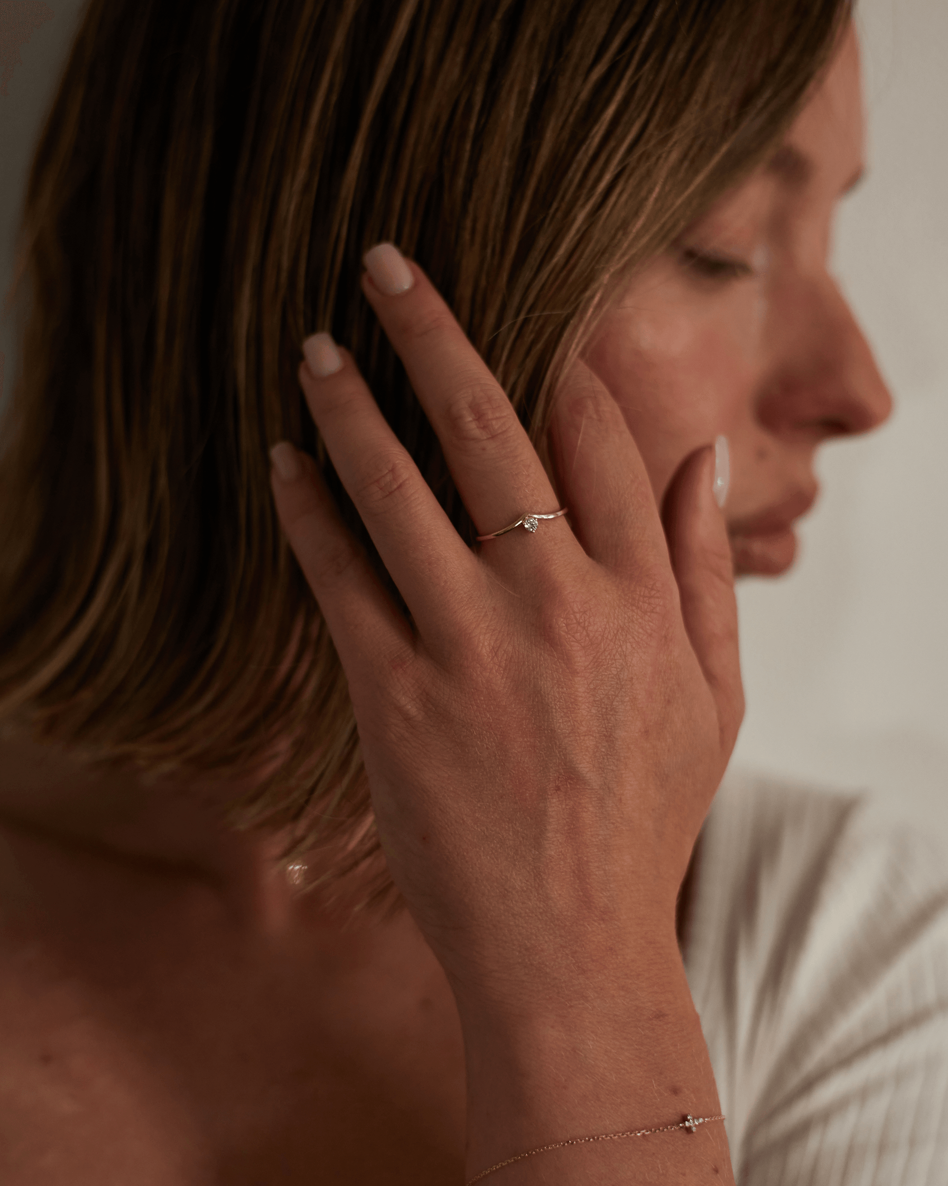Elegant and minimalist, our wishbone diamond ring features a 0.07ct round-cut diamond set in a sleek, modern design. Its subtle curve and clean lines make it a timeless piece, perfect for both everyday wear and special occasions.